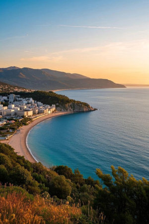 Discover the stunning coastline of Sperlonga, where golden sandy beaches meet crystal-clear waters, enhanced by charming coastal homes and a vibrant sky.