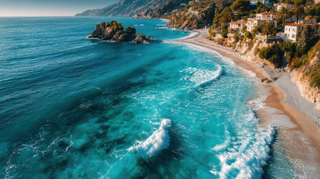 Tropical beach with turquoise water and waves crashing on shore near coastal houses surrounded by nature and perfect for travel adventure.