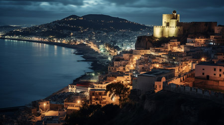 View on night sea coastline of southern Italy town. Tropea night sea panorama in Calabria region. Bright light lamp on city rock stone wall.
