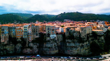 Tropea, Italy - September 10, 2019: Landscape with Tropea beach and old town buildings on mountain rock.