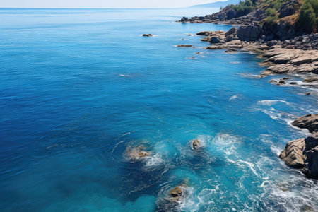 An overhead perspective capturing the expanse of a large body of water surrounded by land, An overhead capture of clear emerald sea with a rocky shore, AI Generated
