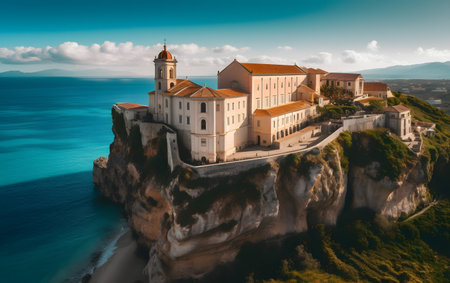 Tropea, Calabria. Aerial view of city, monastery and coastline from drone perspective.