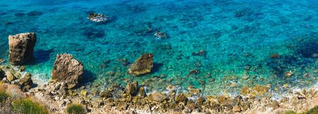 Beautiful sea coast of the Adriatic sea. Azure water and brown rocks. Top view