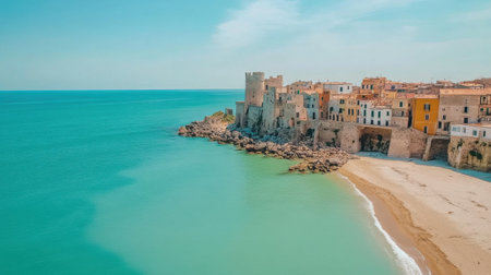 The serene landscape features a stunning beach with golden sand, crystal-clear turquoise waters, and ancient ruins perched atop the cliffs under a bright blue sky.