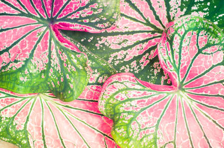 Closeup top view sweet pink caladium leaves in the garden, selective focus