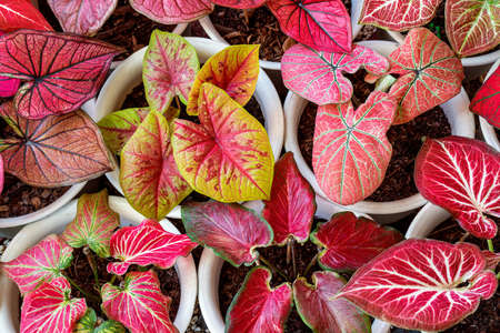 Pattern of caladium foliage plant red and yellow color on the pot.