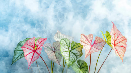 Discover the beauty of vibrant caladium leaves featuring striking pink veins against a soft blue backdrop, perfect for nature-themed decor and inspiration.