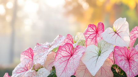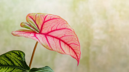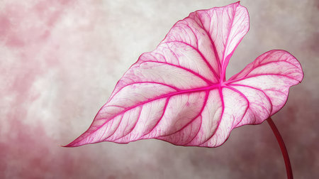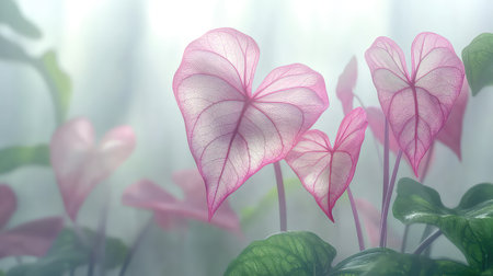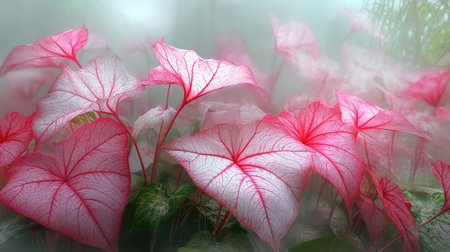 Explore the enchanting beauty of caladium plant leaves in shades of pink and red, highlighted by intricate veins against a soft, misty background.