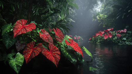 A stunning view of a tropical garden featuring vibrant red leaves surrounded by misty water that creates a serene atmosphere in the jungle.