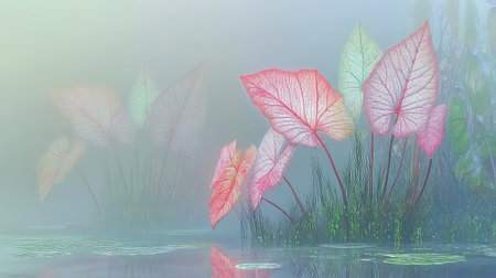 This captivating image features colorful caladium leaves surrounded by a serene mist, beautifully reflected on the calm water surface, showcasing nature's tranquility.
