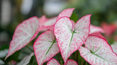 Capturing the beauty of vibrant caladium leaves, this image showcases heart-shaped foliage with striking pink edges, set against a lush green background, perfect for nature enthusiasts.