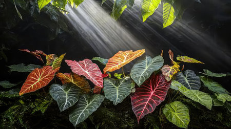 Experience the beauty of tropical leaves illuminated by soft sunlight, showcasing vibrant colors and intricate patterns that highlight the natural world.