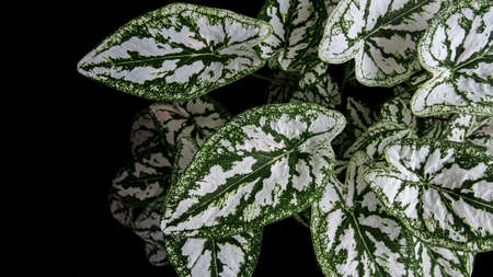 Heart shaped green leaves mottled with white of Caladium 'Mini White' (Caladium humboldtii), the decorative tropical foliage plant on black background.