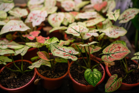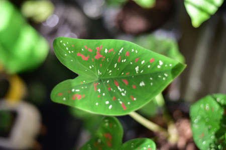 Colorful exotic Caladium plants name Hanu Ma Nom Phlapphla. It is a highly popular and expensive ornamental plant.