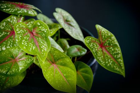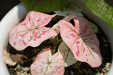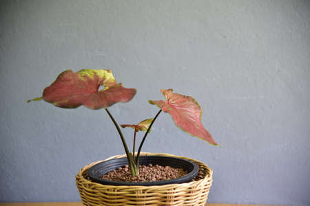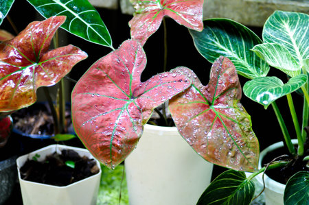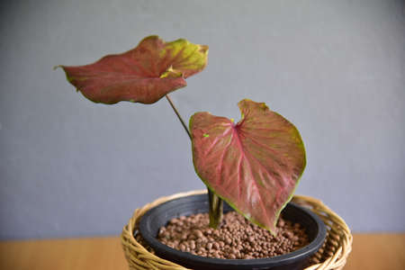 Close-up Of Caladium bicolor or Queen of the leafy plants in a plastic potted.