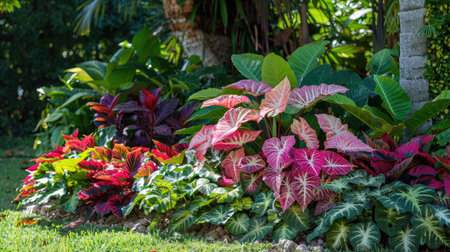 A beautifully designed garden corner with a mix of Caladium plants and other vibrant foliage.