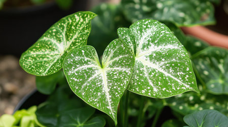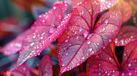 A close-up of dew-covered Caladium leaves, capturing the freshness and beauty of the morning garden.