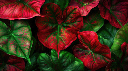 Close-up of Caladium leaves with striking red veins and green edges, creating a beautiful natural pattern.