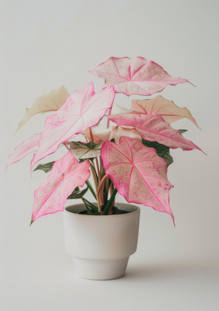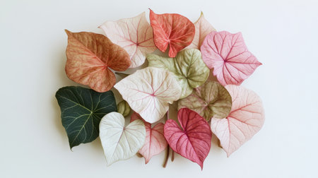 A stunning arrangement of colorful caladium leaves in shades of pink and green against a white background, perfect for home decor or floral design inspiration.