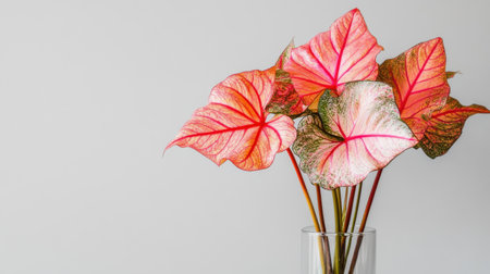 A stunning collection of vibrant caladium leaves in a clear vase set against a simple gray background, perfect for enhancing home decor and floral arrangements.