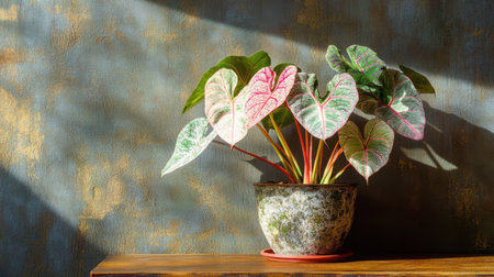A stunning indoor plant with distinctive heart-shaped leaves bathed in natural sunlight. The vibrant colors create a warm atmosphere perfect for home decoration.