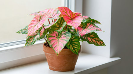 A striking caladium plant showcases vivid pink and green leaves on a sunny windowsill, bringing a refreshing touch of nature to any indoor environment.