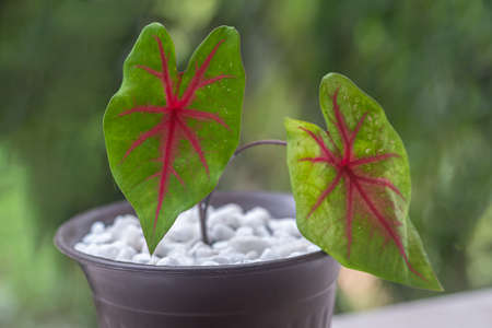 Caladium bicolor or Queen of the leafy plants in a plastic potted placed on the grass in the garden. Heart of Jesus. Selective focus. Colorful of Bon leaves with copy space for text