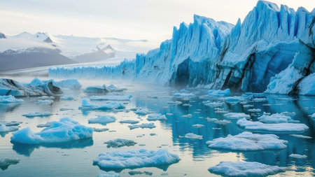 A stunning landscape photograph of a massive glacier with jagged, blue-tinged ice, reflecting perfectly in the still, calm waters of a glacial lagoon. The serene and majestic scene captures the pristine beauty of the polar regions. This image highlights the grandeur of nature and can also be used to discuss topics like climate change and melting ice.