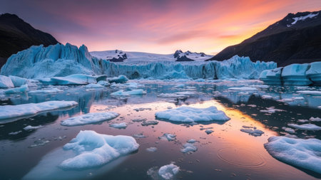 Vibrant sunset bathes icy peaks and a dwindling glacier in warm hues, capturing tranquil wilderness and evolving glacial beauty.