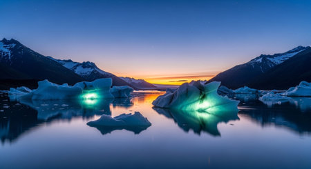 A scenic view of a glacial landscape features blue icebergs and snow-capped mountains reflected in the lake's calm water. The composition showcases the natural environment during the dusk, with the sky displaying colorful shades. The image has potential for travel, environmental, or educational purposes.