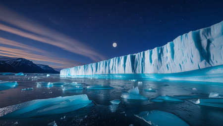A stunning image of a large iceberg at night under a starry sky and a full moon, surrounded by smaller ice fragments floating in the dark water. The scene evokes a sense of cold and tranquility in a remote Arctic landscape.