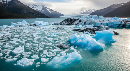 A stunning landscape of a glacial lake filled with countless icebergs of varying sizes, some glowing with a vibrant blue color. In the distance, a massive glacier flows down between snow-capped mountains, showcasing the raw and beautiful, yet fragile, arctic environment.
