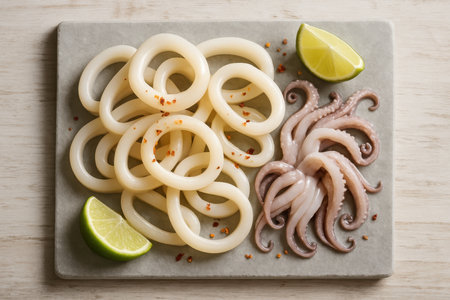 Fresh raw squid rings and tentacles with lime wedges and chili flakes arranged on a grey slate board, ready for cooking.