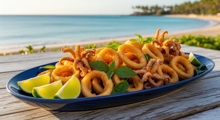 Crispy golden fried calamari rings and tentacles served with fresh lime wedges and basil on a blue platter. delicious seafood meal on a rustic wooden table with a tropical beach and ocean in the background.