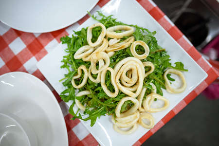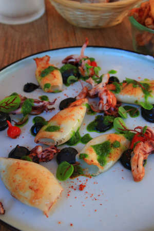 Prepared plate of cuttlefish and squid on the table of a french restaurant