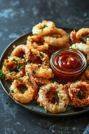 A rustic plate of crispy fried calamari rings garnished with parsley, accompanied by a jar of ketchup, shot at eye level on a textured slate background