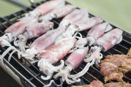 Squids and pork are grill on stove