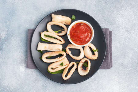 Fried squid rings with tomato sauce and lemon. Black plate, gray concrete background copy space. Top view.