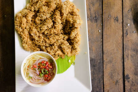 Thai cuisine and food Thai traditional crispy catfish salad on wood table