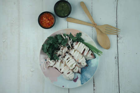 Close up of steamed squid served with coriander and eating with spicy seafood sauce