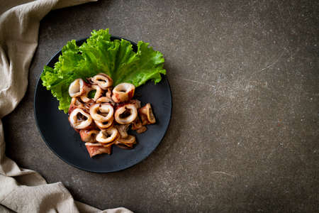Fried squid with garlic on black table background