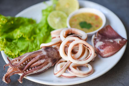 Fresh squid cooked boiled with lettuce vegetable salad lemon and seafood sauce on table background, squid rings on white plate