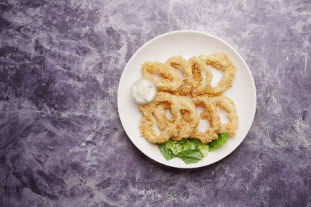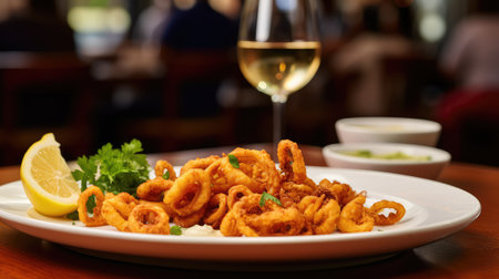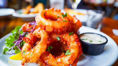 Fried squid ring in restaurant with sauce. Generative AI illustration