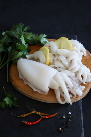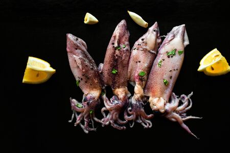 Two fresh squids with lemon and herbs prepared for cooking on dark background. Fresh seafood. Directly above.