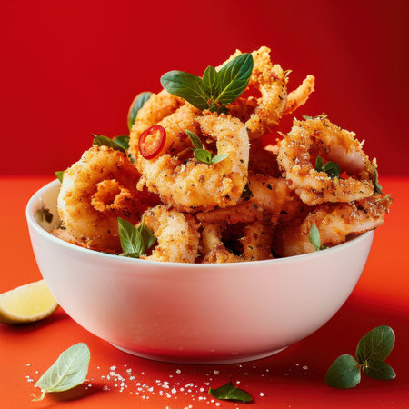 Crispy fried calamari served with vibrant herbs and garnishes in a restaurant bowl
