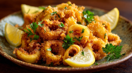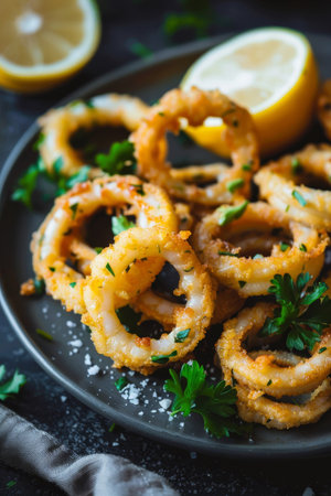 This enticing photo showcases crispy fried calamari served with fresh lemon wedges and parsley garnish, perfect for seafood lovers and food photography.