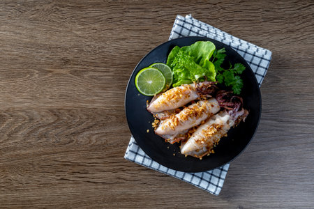 Fried squid with garlic and pepper in black plate on wooden table in seafood style.