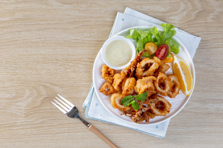 Calamari, Appetizer Crispy fried squid ring with tartar sauce on wood background traditional italian food