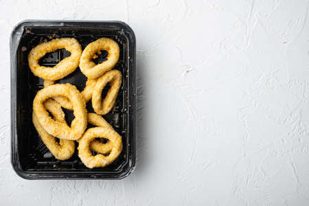 Squid rings in breadcrumbs pack set, on white stone table background, top view flat lay, with copy space for text