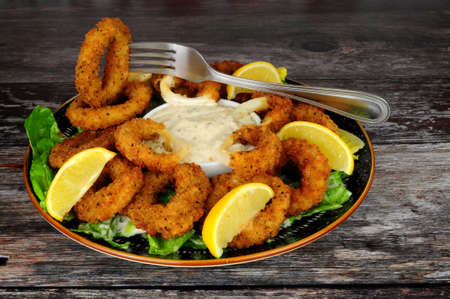Breadcrumb covered salt and pepper calamari squid rings with tartar dipping sauce and fresh lemons
